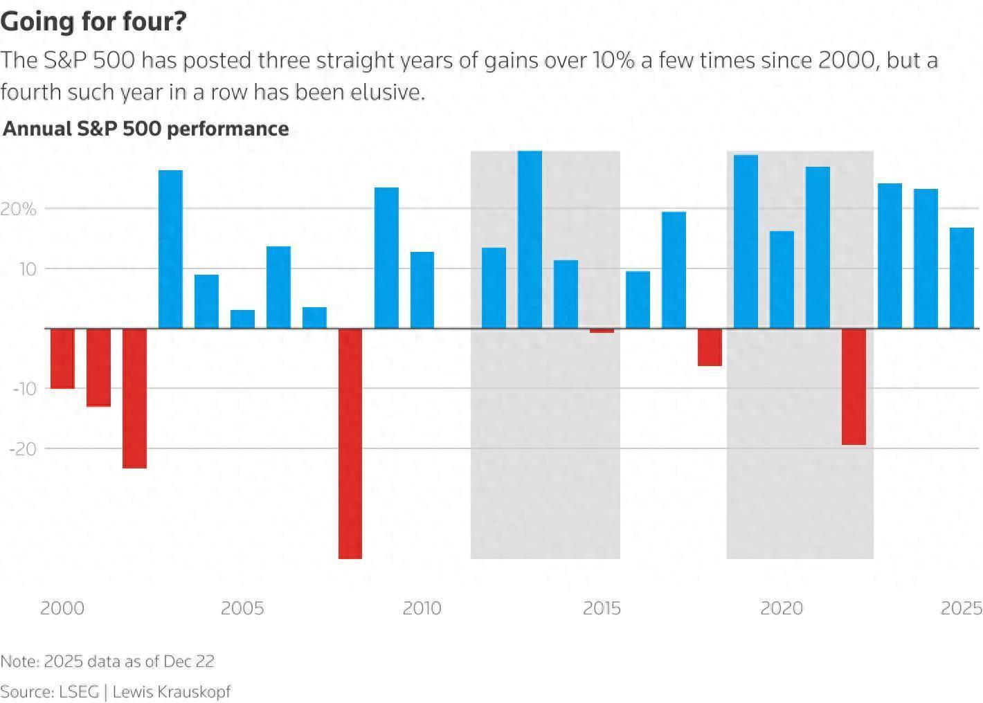 智通财经APP获悉,好意思国股市以连系第三年收场双位数百分比涨幅扫尾了2025年。始于2022年10月的这轮好意思股牛市,一直由对AI的乐不雅情愫、利率下降以及经济在衰竭担忧中执续增长所推进。标普500指数在2025年上升跳跃16%,此前在2024年上升23%,2023年上升24%。不外,要在2026年连系第四年取得亮眼进展粗略是个劳苦的任务,需要强盛的企业盈利、态度偏鸽的好意思联储、以及执续强盛的东谈主工智能(AI)磋磨支拨。